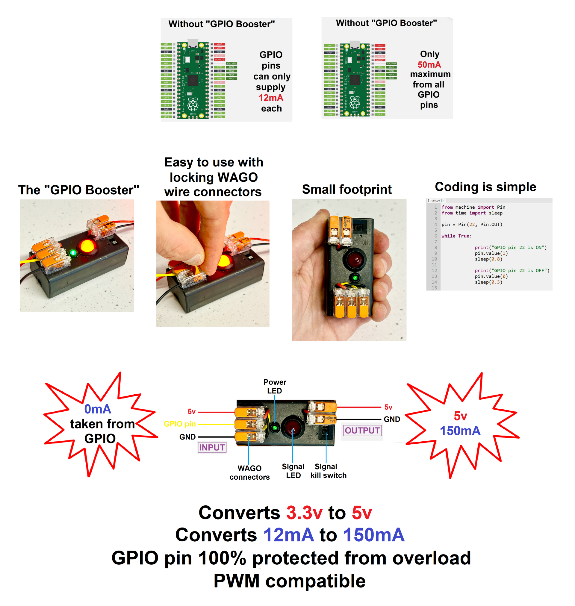 This prototype provides protection, signal amplification, and user indication.